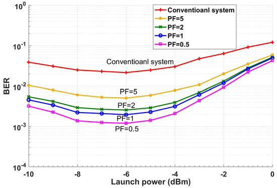 Now, we show the improvement of the BER for the OFDM fiber optic link upgraded with the CDS. It is customary to project the Q-factor based on BER and Gaussian noise statistics as [33,42,43]: