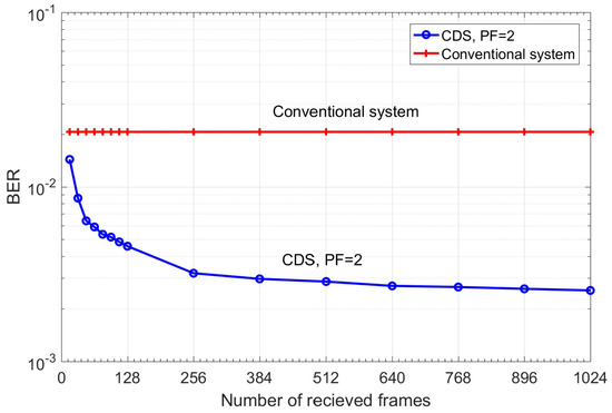 The policy determines the goals that the CDS should achieve. The first goal is that the BER should be under the FEC threshold. The second one is for an acceptable computational cost. The storage or computational cost depends on PF and (Figure 12). We define as the difference in BER between current received frames and previous received frames with a step of 128 frames. For example, we can set our policy that the desired should be less than 5 × 10−5. From Figure 12, we find that if the current received frame is 768 and the previous received frame is 640, then 4 × 10−5, which is less than the desired . Therefore, the CDS stops the model extraction process after receiving 768 frames and saves the model and the posterior probability in the CDS model library.