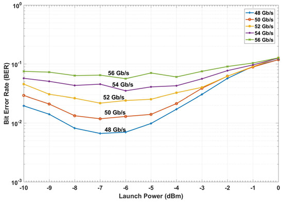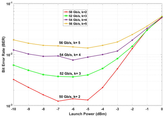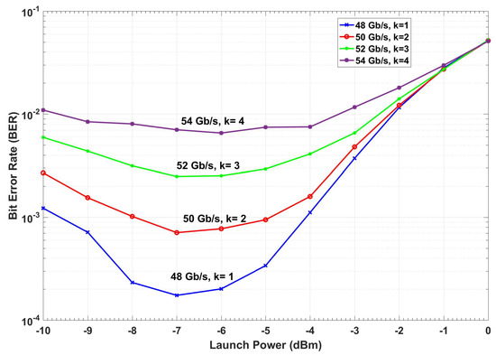 The BER versus launch power of a conventional fiber optic communications system (i.e., without CDS) is shown in Figure 15. The BER is calculated based on the geometric boundaries between the symbols for the conventional system. At low launch powers, the BER decreases with the launch power since the SNR improves. However, at higher launch power (greater than −4 dBm), the BER increases with launch power due to nonlinear impairments. If we consider 1.03 × 10−2 (with 14.3% overhead) as the FEC threshold [40], we can see from Figure 15 that the maximum achievable data rate is 48 Gb/s. The adaptive linear equalizer (See Figure 13 and Figure 14) mitigates the linear distortion, and hence, the nonlinear distortion is dominant for data rates greater than 48 Gb/s. The CDS now extracts the model for k = 1 (which corresponds to the data rate of 48 Gb/s) in the preceptor while operating in the BER improvement mode (see Figure 16) and saves the model for 48 Gb/s as in the model library. It may be noted that the BER for the case of 48 Gb/s with CDS (Figure 16, k = 1) is lower than the BER of the conventional system at the same data rate (Figure 15) because of the Bayesian approach (see Section 3.1.2). The CDS uses 2 Gb/s discretization step for data rate and a step of 1 dB for the launch power. In the next cycle (k = 2), the executive predicts the BER for increasing the data rate to 50 Gb/s using the model (see Equations (7) and (8)) and is shown in Figure 17. As can be seen in Figure 17, the predicted BER is lower than the FEC threshold and the action of enhancing the data rate is communicated to the transmitter using a low data rate link and transmitter enhances the data rate. Since there is no model in the model library for the case of the data rate of 50 Gb/s, the perceptor will switch to the prediction mode also, and predicts based on the model for 48 Gb/s (i.e., ) and the BER is computed. It is found that the BER is under the FEC threshold as predicted by the executive (See Figure 17, k = 2). Since the BER is now below the FEC threshold, the preceptor will operate in BER improvement mode and it will extract the model for k = 2 (). Therefore, the BER can be improved further (Figure 16), for example, if we compare the BERs in Figure 16 and Figure 17, when k = 2, we find that the BER is lower in the BER improvement mode (See Figure 16) as compared to that in the prediction by the executive (see Figure 17). Since the objective is to enhance the data rate (with BER below the FEC threshold), in the next cycle (k = 3), the executive will predict the BER for the enhanced data rate of 52 Gb/s and the predicted BER is shown in Figure 17 (k = 3) and this process continues. This process of cycling through the BER improvement mode and prediction mode will continue and the executive will increase the data rate up to 56 Gb/s (k = 5 in Figure 17). At this point, the executive finds that the predictive model cannot bring the BER under the FEC threshold (see Figure 17). Therefore, it will decrease the data rate and the steady-state data rate will be 54 Gb/s. The system will continue to operate at 54 Gb/s until there is a disruption to the system. When the disturbance arises, the BER increases and the executive will decrease the data rate, and the perceptor will operate in the prediction mode and choose the closest model from the model library to predict the transmitted data.