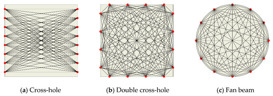 Similar to the CT technique, the changes of time-of-flight [11,12,13,14,24,25,26] and wave amplitude [27,28,29] are both commonly used in LWT as signal parameters in image reconstruction algorithms, which are related to wave velocity and wave attenuation respectively. For the early ultrasonic reconstruction algorithms, the classical Fourier inversion technique [30] and filtered back-projection technique [9,10,31,32] have been used to reconstruct the image by referring to the X-ray CT technique. However, all of those classical techniques have certain limitations, such as low capability of anti-noise interference, high requirement for precise sampling geometry, etc. Considering that the wave propagation path is a fold line due to the change of wave velocity in the damage region, the iterative reconstruction algorithms of seismic wave tomography have also been applied to ultrasonic tomography. The iterative reconstruction algorithms include an algebraic reconstruction technique [19,33], simultaneous iterative reconstruction technique [13,34,35,36] and statistical iterative method implemented by some iteration algorithms of maximum likelihood expectation [37,38]. However, the iterative reconstruction algorithm-based techniques have the disadvantage of the iterative convergence problem and low computational efficiency. In addition, the schemes for the transducer array of conventional LWTs usually employ linear array configuration such as cross-hole [11] and double cross-hole [12], and the circular array configuration with fan beam projection [12] as shown in Figure 1. Transducers on the boundary of the inspection region both transmit and receive wave signals. It can be found that those schemes need many transducers or to move the transducers frequently when only using a pair of transducers.