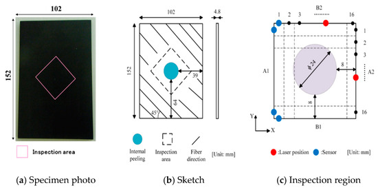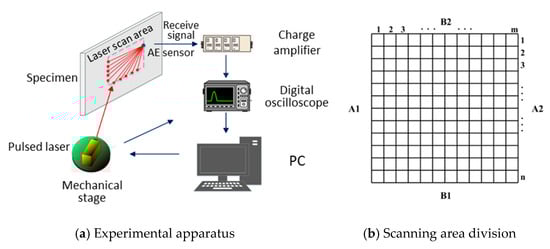 Figure 2a presents a schematic overview of experiments for the data acquisition. A pulse laser is used to generate Lamb waves based on a thermoelastic mechanism. The excited Lamb waves depends on the duration of the used laser pulse and the material properties. The duration of the used laser pulse is 8.5 ns (120 MHz), resulting in a wave spectrum in which the wave energy is mainly distributed from 100 kHz~300 kHz for the aluminum and CFRP specimens. Table 1 and Table 2 present the material properties of the aluminum and CFRP specimens used in the following experiments. An acoustic emission (AE) sensor attached on a particular location of a plate is employed to receive wave signals. In the experiment, a rectangular inspection region needs to be determined firstly, which is divided by grids as shown in Figure 2b. The size of the inspection region depends on the attenuation of wave propagation. In general, the inspection region of aluminum specimens is larger than that of CFRP specimens since the wave attenuation is more severe in the CFRP composites. The size of the grids is determined by the wavelength of the detection waves in the experiment, and it is usually to divide into at least five grids in one wavelength to effectively describe the attenuation of the waves. For the convenience of the later description, the four edges of the rectangular inspection region are defined as A1, B1, A2, and B2 in counterclockwise direction as shown in Figure 2b.