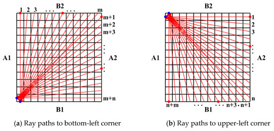 The experimental data-collecting scheme is shown in Figure 3. In Figure 3a, the laser irradiates step-by-step along the B2 and A2 to sweep all available positions to generate Lamb waves; meanwhile, the AE sensor is fixed in the bottom-left corner (the first grid of B1 edge and the last grid of A1 edge) for data acquisition. In Figure 3b, the ray paths start from the first grid of the A1 edge to all grids of the A2 edge, and from the first grid of the B2 edge to all grids of the B1 edge. Thus, two sets of signal data are obtained. We can see that both of the ray paths in Figure 3a,b are covering the whole inspection region, which implies the obtained experimental data can be used to evaluate the integrity of the inspection region. In addition, it should be noted that the data-collecting scheme can be realized with high efficiency because of automatic laser-scanning and infrequent position change of the AE sensor.
