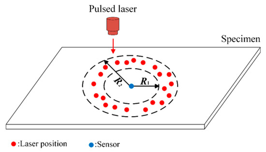 Furthermore, reference measurements in an intact region need to be performed to realize damage image reconstruction. Figure 4 presents the experimental scheme for reference data acquisition. The pulse laser randomly irradiates a intact ring region in the plate, and a sensor in the center of the ring region receives wave signals propagating over different distances and along different directions. Based on those wave signals, reference data related to the ray paths in Figure 3 can be calculated by linear interpolation.