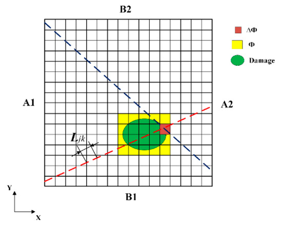 After selecting the two sets of ray paths passing through the damaged region, the region of ray-path intersection as shown in Figure 5 is considered as the initial suspected region, and the sum of , as marked by Φ, is the rough area of the possible damage. As a result, the possible damage regions can be localized, leading to the significantly low computational cost in the following step.