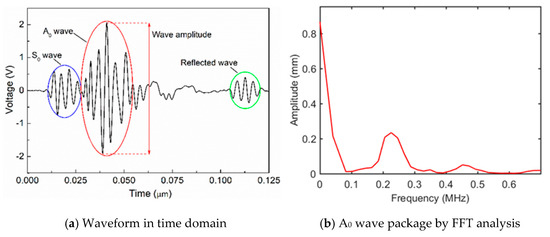 A rectangular aluminum plate (thickness: 5.0 mm) containing a non-penetrating notch (length: 20 mm, width: 2 mm and depth: 2.5 mm), as shown in Figure 6a,b, was used. By considering the wave attenuation in the aluminum plate, the inspection region was determined as 60 × 60 mm2 and divided into 24 × 24 grids with a side length of 2.5 mm (Figure 6c). According to the data-collecting scheme shown in Figure 3a,b (m = 24, n = 24), the pulse laser irradiated along the specified paths (B2→A2 and A2→B1), meanwhile, an AE sensor was placed in the appropriate location (the solid blue circles in Figure 3a,b) to receive wave signals. As a result, only 24 × 4 = 96 waveform data were used in this inspection. Figure 7 presents a typical wave signal received by the AE sensor. We can see from Figure 7a that the main wave mode in the waveform is the second strong wave packet, corresponding to the A0 mode. The frequency of the A0 mode wave packet is mainly in range of 200 kHz to 300 kHz as shown in Figure 7b. After extracting the amplitudes of the second wave packet in the waveforms of all ray paths, i.e., and , the reconstruction algorithm was employed to calculate the damage image.