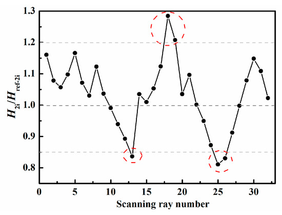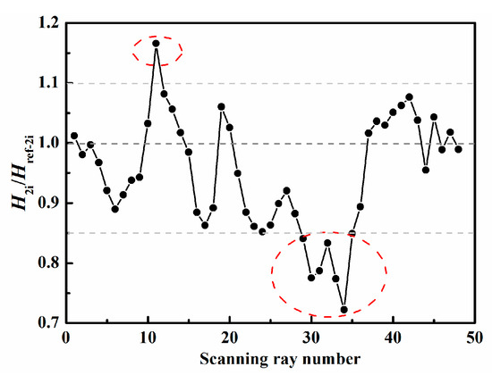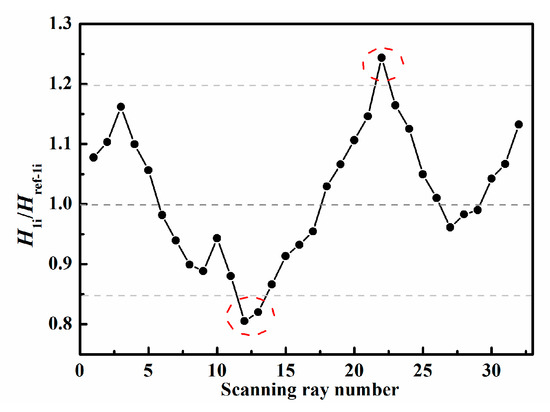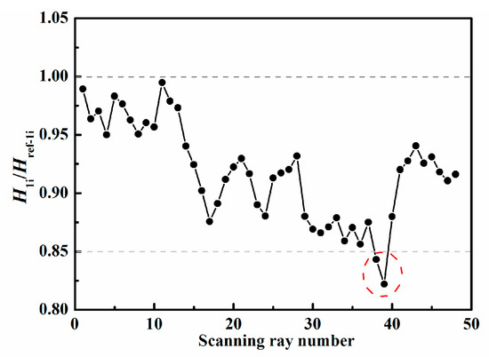 Therefore, the ratio of the measured value to the reference value could be calculated, and the thresholds could be determined according to the maximal and minimum values of the ratio values. The ratio curves of the ray paths to the bottom-left corner in Figure 3a and of the ray paths to the upper-left corner in Figure 3b are shown in Figure 13 and Figure 14, from which we could set and . Then the possible damaged region could be obtained in the first step.