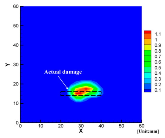 Based on the above thresholds, the number of unknowns in 24 × 24 = 576 grids decreased from 576 to 18, i.e., the attenuation change was only in the possible damaged area after the first step. Therefore, it could be easy to carry out the second step. Figure 10 illustrates the image result obtained from Equation (11) by using the least-square method. In Figure 10, the rectangular of the black dotted line represents the actual damage, and the value of the color bar denotes the change of attenuation coefficient in Equation (5). It can be considered that the area is damaged more seriously when the value of is larger. We can see that the location of the non-penetrating notch can be accurately detected, and the length of the notch can be estimated with about 15% error. However, it is a pity to see that the shape cannot be reconstructed. This error is mainly due to the larger grid size (2.5 mm) compared with the width of the notch (2 mm). However, reducing the grid size still cannot improve the result because the wavelength of excited A0 mode (15–20 mm) is much larger than the width of the notch. So, it can be predicted that the present technique cannot perfectly reconstruct the type of damage with a long and narrow shape.