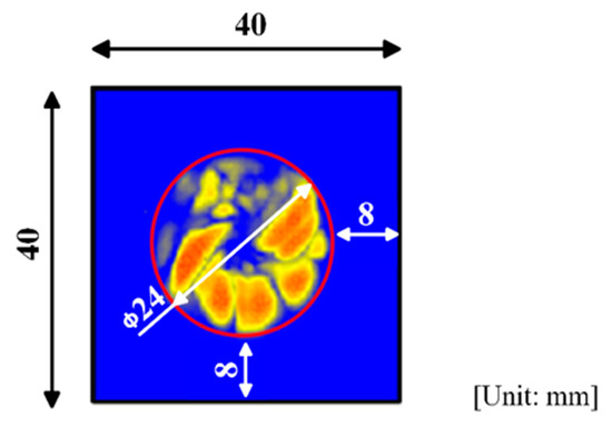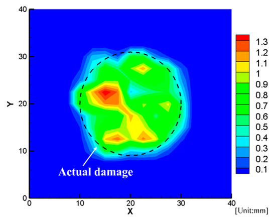 To validate the improved rapid reconstruction technique, a 32-layer quasi-isotropic CFRP laminated plate with a stacking sequence of [(450/00/–450/900)4]s was used. The center of the plate was impacted by a rigid body of a lower semi-spherical shape. Its mass is 4.6 kg and the impact energy is 4.8 J. As a result, an internal delamination occurred. Firstly, a conventional ultrasonic C-scanning was performed by putting the specimen into a water bath with the scanning conditions: pitch = 0.5 mm and frequency ranging from 5 MHz to 10 MHz. From the ultrasonic C-scanning result as shown in Figure 11, it was found that there was an internal delamination in the CFRP laminated plate, and the diameter of the delamination was around 24.0 mm.
