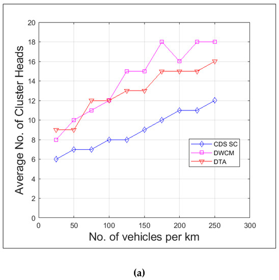 The cluster head density is measured as the number of vehicles selected as cluster heads per kilometer. Figure 12a compares the cluster head density of DTA, DWCM, and the proposed protocol CDS_SC. The CDS_SC exhibits a slow increase in the number of cluster heads when the number of vehicles increases. That is when the number of vehicles increases by ten times, the number of cluster heads increases only by twice and this is due to the increase in the cluster size. Figure 12b shows the percentage of vehicles that are identified as cluster heads, cluster members, gateways, and un-clustered in sparse, average, and dense traffic scenarios. The reduction in cluster heads and gateways clearly reveals the achievement of the reduction in the number of rebroadcasting vehicles. In dense and average traffic scenarios the un-clustered vehicles were almost 0% (<1%), and only 6% of vehicles acted as cluster heads and 1% of vehicles acted as gateways. Hence, a total of only 7% of vehicles are rebroadcasting.