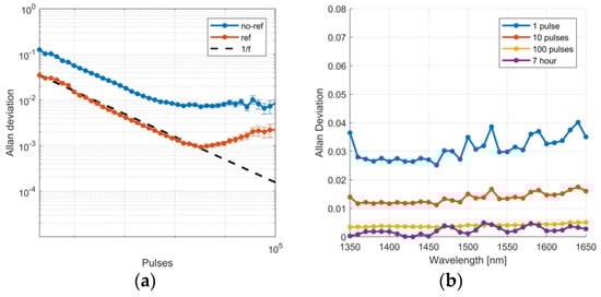 (a) Allan-Werle deviation of the measured pulse intensity with and without the reference signal. The center wavelength of the channel shown is 1500 ± 2.5 nm. Spectralon was used as the target at 5 m distance. The data was collected in 14 h. (b) The Allan-Werle deviation for averaged 1, 10 and 100 pulses as well as 7-hour values are shown for center wavelengths between 1350 and 1650 nm with 10 nm increments.