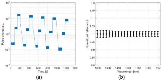 The Allan-Werle deviation analysis [23] was used to study the stability and noise performance of the spectral measurement. A white calibration target (Labsphere, Spectralon SRS-99-050, North Sutton, NH, USA) was placed 5 m from the instrument. The custom-form voltage ramp was applied to FPI at a 30 Hz repetition rate. The measurement was conducted continuously for 14 h in a temperature-controlled laboratory space. An Allan-Werle deviation plot of a single channel (1500 nm ± 2.5 nm center wavelength) extracted from the spectra is shown in Figure 5a. For comparison, both the raw intensity and the intensity corrected by the reference detector signal are shown. The noise performance and stability of the measurement are considerably improved by the active reference. Pulse-to-pulse deviation is reduced from 9% to 2% and the 7-hour Allan-Werle deviation is below 0.5% for all wavelengths. The analysis was repeated for the whole wavelength range with 10 nm increments in the central wavelength. The results are shown in Figure 5b. The 1, 10 and 100 pulses, as well as the 7-h Allan-Werle deviation are comparable with all wavelengths. The active reference efficiently replaces the otherwise frequent need for calibrations necessary to account for the SC drifts. The best possible precision of 0.1% is achieved with a 2000 pulse average.
