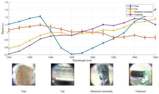 Selected spectra of objects from the field-trial. Each spectrum is an average over 10 spectral measurements with a 100 Hz measurement rate. The standard error of the mean of the 10 spectra are shown as error bars. The test vehicle was driven with a speed ranging between 0–10 km/h.