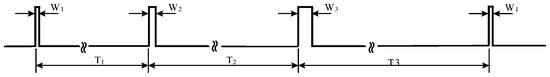 The echo signals generated by the three transmitted signals are pulse-compressed, time-aligned with zero-distance time as reference point, and non-coherent accumulation processing is performed, which can effectively improve the detection capability of the radar. Let the three pulse signals shown in Figure 1 form a transmission signal group, where the pulse width of the ith transmitting pulse is , the amplitude A of the transmitted signal is constant, and the modulation bandwidth is . Each group of transmitting signals is