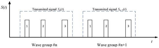 Assuming that the pulse repetition period (PRP) of the radar is , the radar transmits a pulse group of three pulses, as shown in Figure 2, at that PRF. In the nth group transmission, a combination of certain pulses under the control parameter is repeatedly transmitted K times. Obviously, according to the different control parameters, the pulse repetition period , pulse width , frequency modulation bandwidth and the emission energy achieved are different. From this, different pulse accumulation numbers, target detection effect, range resolution effect and precision of range measurement can be obtained.