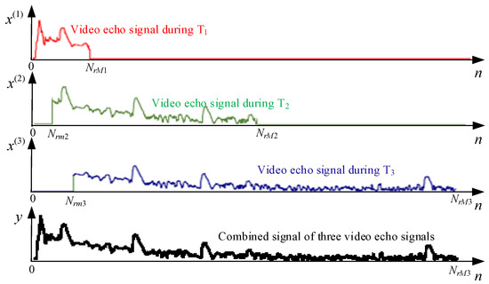 where is the dimension vector, which is the maximum distance unit number. It can be seen from Equation (23) that the distance range can be divided into the following five distance segments (represented by distance quantization unit), and the corresponding range segments are: , , , and , respectively. The rows in Equation (23) are summed and averaged to obtain a composite video signal during a transmit pulse group as shown in Figure 3.