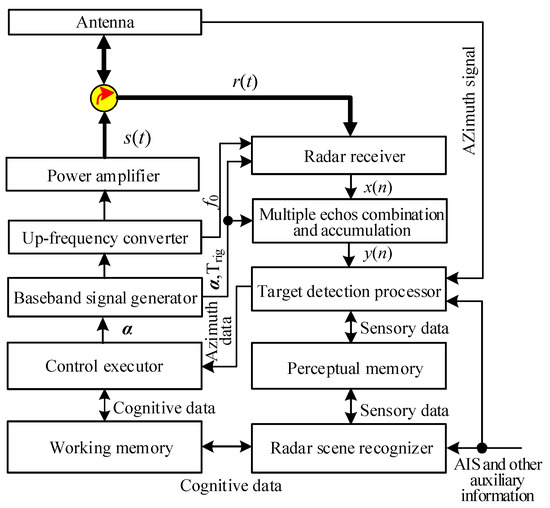 Stinco et al. [29] pointed out that the application of cognitive radar technology in active radar has some technical difficulties, such as cognitive requirements waveforms and real-time reconfigurability of circuits. Based on such design ideas and existing problems, this paper designs a control method based on the effective LFM waveform of marine radar. The method uses three control parameters to control the radar pulse width (energy), the transmit pulse repetition frequency and the received signal pulse accumulation number. This effectively avoids the technical problem that the signal change depends on the hardware circuit structure change. According to the transmitting signal model and waveform control parameter selection method given in the first two sections of this paper, as well as the accumulation and processing method of echo signal, and the basic architecture of cognitive radars described in [4,13], this paper presents the basic structure of cognitive marine radar as shown in Figure 4.