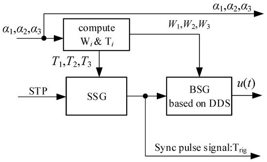 In Figure 4, the radar scene sensor senses the information of the target spatial distribution characteristics, the radar geographical environment, and the clutter according to the target detection status of the radar target detection unit, auxiliary information such as Automatic Identification System (AIS) and electronic chart, and generates perceptual information and cognitive information. These two kinds of information are recorded in the sensing memory and the control working memory, respectively. The radar control execution unit acquires the target spatial distribution information (cognitive data) of the target existence orientation by the working memory, and analyzes and generates the waveform control parameter according to the waveform selection criterion, and controls the baseband signal generator to generate the required transmit baseband signal . The basic structure of the baseband signal generator is shown in Figure 5, where STP is the System Timing Pulse; SSG is the Synchronization Signal Generator; and BSG is the Baseband Signal Generator. The transmit signal waveform depends only on the control parameters and does not require hardware circuit reconstruction. The radar echo signal received by the radar is sent to the accumulator after being pulse-compressed, and its function is the combination and accumulation of multi-pulse echoes. The accumulator completes the distance splicing and accumulation of the echo signals of one of the transmitted pulse groups as shown in Figure 3, and produces a composite video signal. Then, according to the achievable pulse accumulation number, the composite video signal is subjected to amplitude accumulation, and the accumulated echo video signal is sent to the target detector for target detection processing. The radar target detector performs analysis and processing on the radar target spatial distribution characteristics, radar clutter statistical characteristics and terrestrial regional distribution characteristics while performing target detection. It stores this information in the sensing memory, and updates the working memory according to the azimuth scanning period.