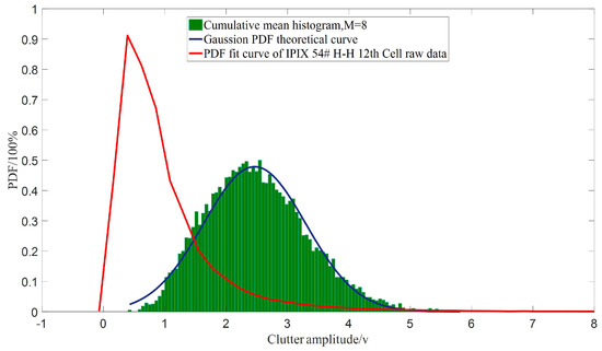 In total, 10,000 average data were obtained by accumulation of every eight data for the 12th range unit in 54♯IPIX radar with polarization of H-H, statistically analyzed to get statistical histogram and used to estimate the mean and variance. The comparison between the distribution obtained from the histogram of the experimental data and the theoretical Gaussian distribution with mean and variance derived from experimental data is shown in Figure 6.