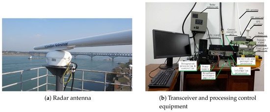 The experimental site was Zhicheng Bridge radar station, the antenna height of which is about 25 m relative to the water surface, as shown in Figure 7a. Figure 7b shows the transceiver and processing equipment, including RF signal generation, microwave power amplification, echo signal processing, target detection and sensing processing, control execution processing, information processing and control, AIS receiver, AIS information processor, etc. that constituted the experimental system. In the experiment, the weather was good and the water surface was calm. The transmitted signal pulse power was 30 W.