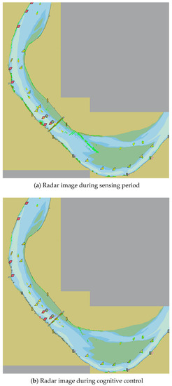 The experimental system alternated between the two phases of radar scene perception and transmitted signal cognitive control in accordance with the workflow of Section 3.4. In the radar scene sensing stage, after receiving processing, the radar image during perception and cognitive control shown in Figure 8a was obtained. It can be seen from the figure that the radar video was omnidirectional and the echo was strong, because the working mode of the radar at this stage was all-round detection, and the radar transmited with basic pulse parameters. In the figure, since the terrestrial video was shielded, although the terrestrial area had a launch, there was no echo display. Obviously, at this stage, the radar transmitted with large energy for omnidirectional detection, the system could effectively realize the perception of the radar working scene, and thus realized more accurate recognition of the radar environment. In addition, the radar target tracking data and AIS target information established at this stage could be used to verify the detection effect of the target in the cognitive control phase of the transmitted signal, thereby supplementing the sensing working memory and adjusting the selection of the control parameters. This feedback adjustment made the radar’s operating characteristics more closely match the radar’s working environment.