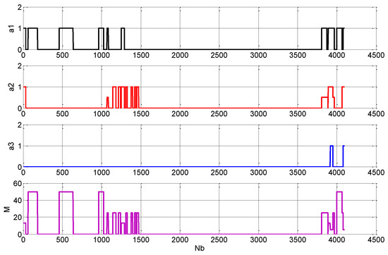 In the stage of the cognitive control of the transmitted signal, thd system controlled the radar transmitter to transmit energy that matched the target distance within the azimuth range in which the target existed. After the reception processing, the radar image shown in Figure 8b was obtained. As can be seen from the figure, the radar was not uniformly emitted in all directions. Compared with Figure 8a, the targets were effectively displayed. However, in the position where the target did not exist, there was no radar echo video display. This shows that the radar did not transmit signal in the direction in which the target did not exist. In contrast to Figure 8a,b also shows that the target echo intensity at a longer distance was reduced. This indicated that, in the orientation of these targets, the transmitted signal energy was lower than the transmitted energy of the radar scene sensing stage, and the radar transmission parameters were adjusted. However, the result of this adjustment still allowed the target to be effectively detected. In the cognitive control stage of the transmitted signal, corresponding to Figure 8b, the integrated processing and the controller recorded and counted the transmitted signal control parameters. Figure 9 shows the change of cognitive control parameters with azimuth of the antenna during azimuth scanning period (in the figure, Nb is the orientation expressed by the number of azimuth quantization units, and the azimuth quantization unit is ).