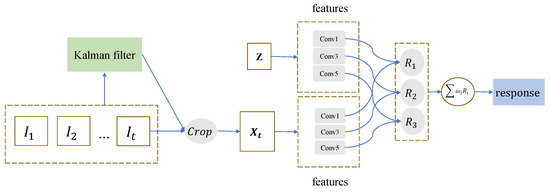 The architecture of the proposed Kalman–Siam network. It consists of a Kalman filter motion trajectory estimation module and a tracking network. The input of the motion trajectory prediction module is an image of the current frame and the previous frame, which predicts the position of the target at the current frame and cropping the search area. In the tracking network module, the templates and the different resolution features of the search image are respectively subjected to correlation operations to obtain response score maps of different layer features. The response score maps are finally combined with a certain weight.