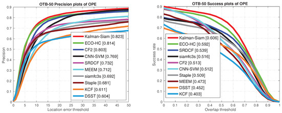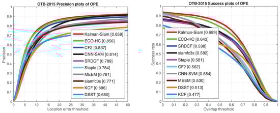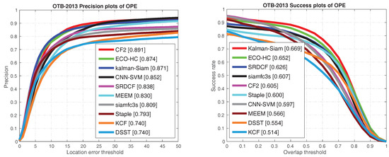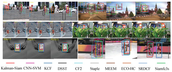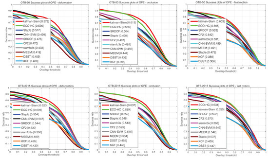 The Kalman–Siam tracker is compared with recent state-of-the-art trackers, including SiamFC3s [16], end-to-end representation learning for correlation filter based tracking(CF2) [33], efficient convolution operators for tracking(ECO-hc) [5], complementary learners for real-time tracking(Staple) [45], online tracking by learning discriminative saliency map with convolutional neural network(CNN-SVM) [30], robust tracking via multiple experts using entropy minimization (MEEM) [46], convolutional features for correlation filter based visual tracking (SRDCF) [6], high-speed tracking with kernelized correlation filters(KCF) [47], and accurate scale estimation for robust visual tracking(DSST) [48] on OTB 2015, OTB50, and OTB2013 benchmarks. The precision plots and success plots of one path evaluation (OPE) are shown in Figure 2, Figure 3 and Figure 4. The comparison shows that Kalman–Siam achieves the best performance among these real-time trackers on all three OTB benchmarks. The Kalman–Siam tracker achieves an AUC score of 65.9%, 60.6%, and 66.9% on OTB2015, OTB50, and OTB2013, respectively, at real-time speed (40 fps). Compared to the SiamFC trackers [16], our tracker obtains significant AUC gains of 7.9%, 9.0%, and 6.2% on OTB2015, OTB50, and OTB2013, respectively. The results prove that the method of Kalman filtering and a multifeature fusion siamese network can be stable and accurate. Figure 5 shows some qualitative results of our tracker compared with 9 real-time trackers. We compared under the curve (AUC) scores and speeds in the OTB benchmark with the state-of-the-art trackers, shown in Table 1. Kalman–Siam also has the speed of a real-time operation while maintaining the highest accuracy. In order to prove that our method has good performance in dealing with three difficult scenes of target occlusion, fast motion and deformation. we show here the OTB-2015 and OTB-50 success plot in the three scenarios of occlusion, fast motion, and target deformation. It can be seen from Figure 6 that our method, Kalman–Siam, has always maintained good performance in these difficult scenarios.