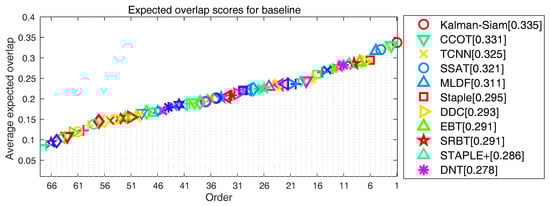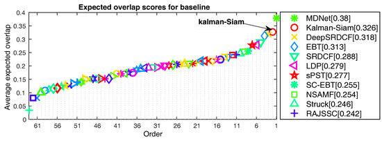 In the VOT2015 [3] and VOT2016 [4] experiments, we present a state-of-the-art comparison with the participants in the challenge. The expected average overlap(EAO) curve evaluated at VOT2015 is shown in Figure 7, comparing 62 state-of-the-art trackers. The results of Kalman–Siam are comparable to those of the most advanced algorithms, and the resulting EAO score of 0.326 is the second best result. MDNet [11] is not compatible with the latest VOT rules because of OTB training data. Our tracker does not use any tracking benchmarks in offline training. The EAO curve evaluated at VOT2016 is shown in Figure 8. it illustrates that our tracker ranks 1st among 70 trackers according to the EAO standard. The resulting EAO score of 0.335 is the best result. In addition, our algorithm can run in real time (40 fps).