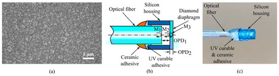 Polycrystalline diamond can be grown by chemical vapor deposition (CVD) and has many unique properties which can be exploited as a sensor material for various sensing applications. A scanning electron micrograph of CVD diamond film is shown in Figure 1a. CVD polycrystalline diamond films have outstanding properties of high Young’s modulus (1143 GPa) [25], low thermal coefficient of expansion (1–1.5 µε/°C), high melting temperature (above 1700 °C in vacuum or oxygen-free environment), ultra-high thermal conductivity (2200 W/cm·K) [26], and inertness to most acids and bases. The refractive index of diamond is 2.4168 (at 587.6 nm) and optically transparent between the deep ultra-violate and the infrared ranges [27]. Although there have been other types of pressure sensors based on diamond piezoresistors [28,29,30,31,32], there is only a limited number of works on optical fiber pressure sensor made of the diamond diaphragm [33]. In this work, a fiber optic sensor fabrication method was used, which makes use of dual polymer-ceramic adhesive for low-cost fabrication and relatively high operation temperature (~275 °C).