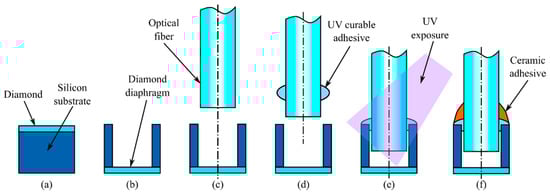 This study aims to design and fabricate a novel and miniature optical pressure sensor based on a polycrystalline diamond diaphragm. Figure 1b illustrates the schematic of the proposed pressure sensor, which consists of a cleaved or polished optical fiber, a silicon cavity structure, a UV curable adhesive, ceramic adhesive, and a synthetic polycrystalline diamond pressure sensing diaphragm. The UV curable adhesive was used for instant curing and sealing of the air cavity. The ceramic adhesive was added on top of the UV curable adhesive for improved linearity of the sensor signal and reduced variations in the pressure sensitivity. A microscopic image of a fabricated sensor is shown in Figure 1c. For high temperature application, an anti-oxidation layer such as titanium oxide (TiO2) or aluminum oxide (Al2O3) can be added to protect the diamond diaphragm from oxidation. The diamond melts at very high temperatures (above 1700 °C), but it suffers from oxidation in an oxygen-rich environment above 800 °C [34]. Exceptional thermal conductivity can help minimize thermal stress in the material and the time constant of temperature measurement. However, high-temperature sensing of the diamond-based pressure sensor is not within the scope of this work. The fabrication process of the proposed sensor is cost-efficient and can provide a good device-to-device uniformity since the diamond diaphragm and the optical housing fabrication processes are performed in batch with very good thickness and dimension control by using conventional semiconductor processes (e.g., CVD, photolithography, and deep reactive ion etching). The rest of fabrication processes can be either easily automated by using motorized precision stages with an optical vision system or performed in batch. Therefore, sensor fabrication can be cost-effective and suitable for low-cost applications. The sensor fabrication processes will be discussed in detail in the following section.