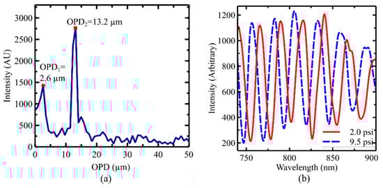 where n is the refractive index of the optical cavity medium and L is the optical cavity length. Due to the limited wavelength range of the used spectrometer, the cavity length measurement based on the FFT is not high enough (~0.5 µm). Therefore, the found optical frequency from the FFT was only used as the center frequency for the following band-pass filtering of the spectrum using the Butterworth filter. The filter wavenumber spectrum was converted back to the wavelength domain and one peak tracing method was used to monitor the change of cavity length with high resolution [36]. Representative spectra from the tested sensor at two different pressures (2.0 and 9.5 psi) are shown in Figure 4b. The detailed signal processing method can also be found in one of the authors’ previous works [35].