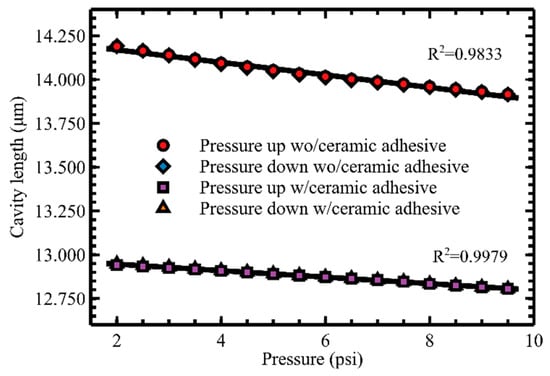 Pressure calibration of the sensor was conducted in a pressure chamber with a reference pressure sensor (MMG250V10, Omega Engineering Inc., Norwalk, CT, USA) to quantify the changes in the sensor air cavity length with respect to the pressure changes. The calibration was performed in a pressure range of 2 to 9.5 psi. However, the upper limit of the pressure range was chosen to be 9.5 psi considering the limitation of the pressure chamber used for the calibration. The calibration result is shown in Figure 5. Two different sets of calibration data overlap closely between pressure increase and decrease cases showing relatively low hysteresis of the sensor. The calibration data show good linearity with an R2 value of 0.9979 and sensitivity of 18.5 nm/psi for combined data from increasing and decreasing pressure with a step size of 0.5 psi at room temperature of 24.5 °C. The sensitivity number is a little higher than that of the FEM model (i.e., 14.3 nm/psi) even though the residual stress in the diamond film reduce the sensitivity. It is believed that the sensitivity higher than the estimation is attributed to the pressure sensitivity coming from the deformation of UV adhesive under pressure change. The pressure resolution of the FP pressure sensor was determined to be 0.0075 psi by using the RMS error divided by the measured pressure sensitivity of the sensor. The pressure calibration result from a sensor before adding the ceramic adhesive is shown in the same plot of Figure 4 in red dots and blue diamonds. The same pressure range, step size, and sequence were used for both datasets. As shown in the result, R2 improved by 1.5% and the pressure sensitivity decreased by 48% after applying the ceramic adhesive. It is believed that the applied ceramic adhesive significantly reduced the deformation and viscoelastic behavior of the UV curable adhesive due to its high Young’s modulus compared to that of the UV curable adhesive. Because of the UV curable polymer shrinkage during the thermal curing of the ceramic adhesive, 8.3% cavity length shrinkage was also observed.