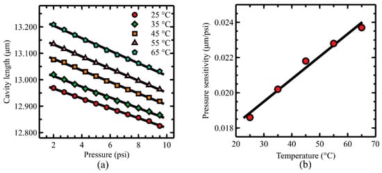 To evaluate the temperature sensitivity of the sensor, a temperature calibration of the air cavity was performed. To measure the temperature sensitivity, the sensor was heated from 25 to 65 °C with an increment of 5 °C under the constant pressure of 2 psi. The cavity lengths were recorded at each temperature level. The obtained temperature calibration results are shown in Figure 7a. According to the result, a linear relationship between the air cavity length and temperature can be observed with good linearity (R2 = 0.9965) and a sensitivity of about 6.4 nm/°C. The temperature sensitivity of the sensor is coming from the expansions of the silicon housing, air trapped in the cavity, and the polymer-ceramic adhesive. Thermal expansion model of the sensor was not performed due to the large shape variation of the applied polymer-ceramic adhesive. The expansion of the polymer is believed to play a significant role in the overall thermal expansion because of its large coefficient of thermal expansion (45 µε/°C) compared to the rest of the materials [37]. The change of the cavity length due to temperature change can be compensated by adding another Fabry–Perot sensor or other types of temperature sensors (e.g., fiber Bragg grating) [35,38].