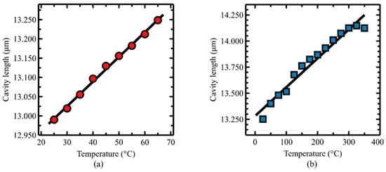 To investigate the maximum operating temperature of the sensor, an additional temperature calibration was performed with a larger temperature range than the previous temperature calibration. For the calibration, the sensor was heated from 25 to 325 °C with an increment of 25 °C under the atmospheric pressure. The cavity lengths were recorded at each temperature level. The obtained temperature calibration results are shown in Figure 7b. According to the result, a relatively linear relationship between the air cavity length and temperature is observed up to 275 °C which is believed to be the maximum operating temperature of the sensor. This operating temperature is much higher than the glass transition temperature of the applied UV adhesive for sensor fabrication (glass transition temperature of the UV adhesive: 78 °C). The ceramic adhesive applied on top of the UV adhesive could have increased the operating temperature of the sensor to a temperature that is much higher than the glass transition temperature of the UV adhesive (operation temperature of the ceramic adhesive: 1760 °C). The increased manufacturability and the operating temperature of the sensor due to the polymer/ceramic adhesive is one of the advantages of the proposed sensor fabrication method.