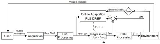 In contrast to PR, where changes in muscle activation strategies can only be noticed when a decision boundary between classes is already crossed, a continuous mapping employed by regressors provides uninterrupted feedback. As such, regression-based controllers are more responsive to user adaptation as corrective measures are immediately reflected [16]. For this reason, users can partly compensate for artificially induced signal non-stationarities when using a regression-based control, contrary to a PR-based controller [17]. This characteristic is particularly advantages as environmental factors are known to perturb signal statistics. Muscle fatigue, perspiration, electrode displacement and even limb positioning contribute to the non-stationarity of recorded EMG resulting in the gradual deterioration of controller performance [18,19,20]. Although user adaptation allows partial compensation for these effects, it is thought that adaptive systems can offer a more robust and less cognitively demanding solution. Such systems learn from newly acquired data as the old model becomes defective. However, this has mostly been studied with PR-based controllers [21,22,23,24,25,26,27] and there are only a few examples of adaptive regression-based controllers [28,29,30]. In both cases, machine adaptation may occur either concurrently with user adaptation in real-time or can be implemented as incremental steps in learning.
