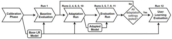 The experiment consisted of 12 consecutive runs, which were a mixture of evaluation and adaptation runs. The sequence of assessments is shown in Figure 3. Run 1 (Baseline) was an evaluation run which gauged the baseline performance of the subject. Subsequently, the effects of machine adaptation were tested in the next 10 runs using RLS-DF using ranging from 0.995–0.93 and RLS-EF with . This was done by alternating sequences of adaptation runs (Runs 2, 4, 6, 8 and 10) and evaluations runs (Runs 3, 5, 7, 9 and 11). During an adaptation run, system adaptation was enabled with the forgetting factor and RLS variant to be tested. Each adaptation run was followed by an evaluation run. which tested the performance of the adapted model. Between each adaptation/evaluation run pair, the regression model was reverted back to the original, batch-trained condition. This was repeated until all the forgetting factors of the RLS-DF and the RLS-EF had been tested. The order of which these were tested was randomised across subjects to prevent biasing of results. The final test, Run 12 (User Learning), was an evaluation run using the base regression model which provided a reference for how much performance gain can be attributed to inherent skill improvement of the user.