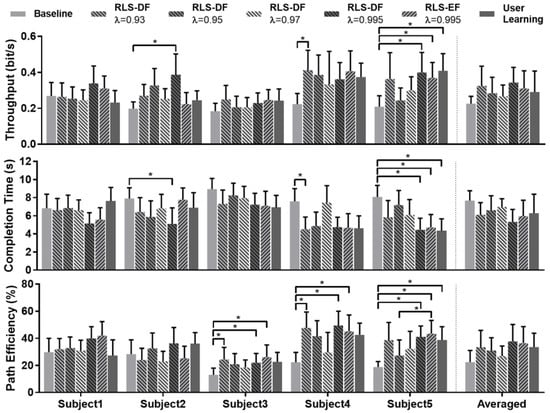Results from the mixed ANOVA’s indicated significant interaction between adaptation settings and subjects for all metrics (TP: F(20.925,392.340) = 2.039, p = 0.005; CT: F(24,450) 2.293, p = 0.001; PE: F(24,450) = 1.979, p = 0.004). As Shapiro–Wilk tests indicated non-normality of some results, the validity of interaction differences were confirmed by conducting the same testing on square-root transformations of the data which resulted in normality. As the study was mainly concerned with the adaptation stability of different forgetting factors, only the simple main effect of adaptation setting was investigated. For every subject, statistical difference between adaptation settings was checked with the Friedman Test. In the case of significance, Dunn–Bonferonni post-hoc tests were conducted with results highlighted in Figure 4. Significant differences spread across all performance metrics and all subjects except Subject 1 were detected. This occurred between “Baseline” and RLS-DF with and 0.995, RLS-EF with and “User Learning”. However, no significance was found in the differences between the forgetting factors of RLS-DF.