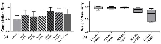 No statistical testing was conducted for CR as the number of samples for each adaptation setting was limited to one per subject. As shown in Figure 5a, RLS-DF with (0.85 ± 0.13) was the best performer on average followed by RLS-EF() (0.80 ± 0.14). While all online-adapted models performed better compared to the initial evaluation with the batch-trained model (Baseline) (0.51 ± 0.12), performance with the same model at the end of testing “User Learning” (0.74 ± 0.16) made the online adaptation with RLS-DF, (0.64 ± 0.17), (0.63 ± 0.17) and (0.70 ± 0.15) obsolete.