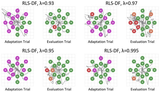 Cursor trajectories of adaptation and evaluation runs with RLS-DF from Subject 4. Green circles represent targets that were successfully reached, orange circles represent targets that were hit but dwell time was insufficient and red circles represent targets that were not hit within the time limit. Purple circles are only present in adaptation runs and represent targets that were reached with the aid of machine adaptation. Though some forgetting factors performed better than others, it can be observed that the solution space is still navigable after adaptation regardless of .