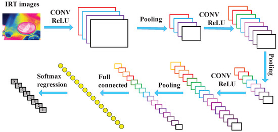 CNN is a type of feed-forward neural network, which consists of several filter stages and one classification stage. The filter stages are mainly composed of four different layers: convolutional layer, batch normalization layer, activation layer, and pooling layer. The classification stage consists of several fully connected layers and followed by a classification layer. Figure 1 illustrates the basic architecture of a CNN in processing IRT images.