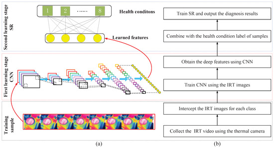 Flowchart of the proposed IRT–CNN method for fault diagnosis of gearbox: (a) illustrative diagrams, and (b) flowchart of training process.