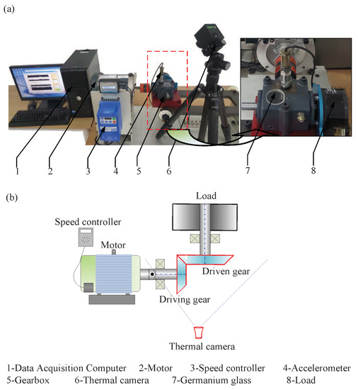 To verify the method, a series of IRT images were collected from a gearbox on SpectraQuest Machinery Fault Simulator (MFS) illustrated in Figure 4. The schematic diagram of the test rig and thermal camera are shown in Figure 4b. The test simulator consists of a three-way gearbox with straight-cut bevel gears, which is driven by a reliance electric motor and loaded under 0.56 Nm (or 5 in-lbs) by a magnetic clutch on the rear of the gearbox. The pinion gear has 18 teeth and the transmission ratio is 1.5. For a comparative study, an accelerometer was also installed on the top of the gearbox to collect the vibration signals with a sampling frequency of 12,800 Hz. During testing, the motor speed was set to a constant speed of 3000 rpm. These steady operating conditions are common in many industrial applications such as pumps and compressors in a petrochemical process.