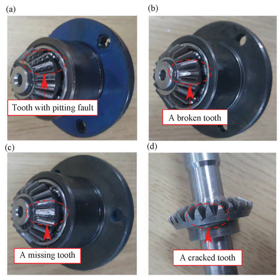 To show the performance of proposed method, eight gear-health conditions are designed to simulate various fault conditions occurring in a gear transmission, which include pitting in the driving tooth (PT), a broken tooth in the driving gear (BT), a missing tooth in the driving gear (MT), crack in the follower tooth (CT), pitting in the driving gear with crack in the follower tooth (PC), broken tooth in the driving gear with crack in the follower tooth (BC), missing tooth in the driving gear with crack in the follower tooth (MC). The details of gear faults are illustrated in Figure 5, which are typical scenarios for early stages of faulty gearbox.