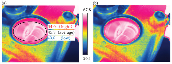 For each health condition of gearbox, the temperature influence was considered, thereby, the IRT videos were recorded throughout the entire temperature-rising process using the thermal camera. The experiment is terminated when the gearbox comes into a steady stage [29,40]. To determine whether the temperature of gearbox reaches a stable condition, a circle around the gear meshing area is added as a reference, in which the high-, average-, and low-temperature values can be observed, as shown in Figure 6a. Please note that there is no marked area using the circle and corresponding color bar in the pseudo-colored frame extracted from IRT video, as shown in Figure 6b. It is worth noting that we conduct only one run of the machine for each fault type. Then, the IRT images are extracted from the obtained IRT videos. The detailed steps for the thermal image acquisition are illustrated in Algorithm 1.