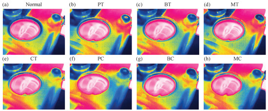 Recently, temperature signal has gained noticeable attention. The temperature signal is often collected using a thermocouple. Since the fault can cause the temperature of machinery increase, recent research has shown the temperature signal carries rich diagnostic information for CM of rotating machinery [23,24,25]. The thermal camera, as an IRT image-measuring device, can measure the surface temperature of the object without contact. As a result, the infrared thermal (IRT)-based remote CM technique has attracted many researchers’ attention [26]. Lim et al. proposed a fault diagnosis method using IRT images along with support vector machine (SVM) to identify machinery faults [26]. Glowacz et al. introduced a novel method for area selection of IRT image differences as the fault features for fault diagnosis of induction motors [22]. Younus Janssens et al. developed an IRT-based intelligent fault diagnosis method of rotating machinery using discrete wavelet transform, feature selection tool and two classifiers [27]. Janssens et al. combined the three features extracted from IRT images with a SVM to conduct the fault diagnosis of rolling bearings [28]. Meanwhile, the Gini coefficient and machine learning methods are applied for early fault detection of rotating machinery using IRT images by Janssens et al. [29]. From the above literature review, we find that IRT images can provide an alternative and non-invasive way for remote monitoring of rotating machinery [30].