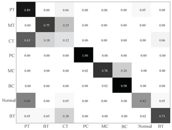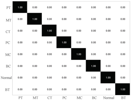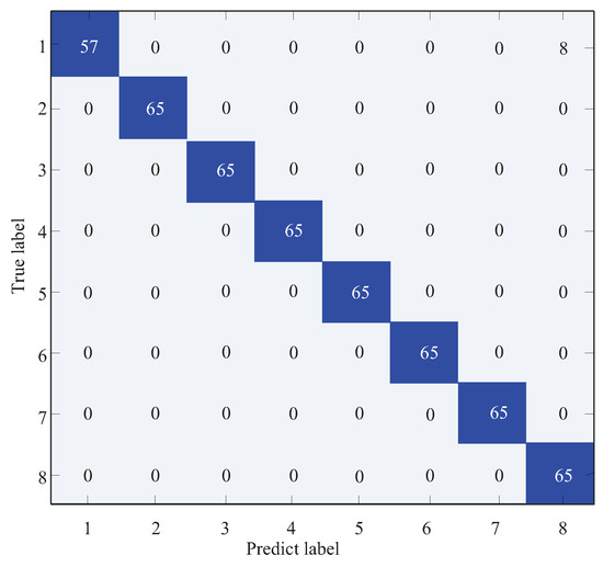 The raw IRT images of gearbox under eight gears with different health conditions are illustrated in Figure 7. It is hard to distinguish the fault types visually though observing the IRT images as the difference of IRT image between each of the health conditions are very small. Thus, CNN is employed to extract features from raw IRT images. The parameter settings of CNN are listed in Table 3. It contains four convolutional layers (, , and ) and two fully connected layers ( and ). The filter size is for the first two convolutional layers and for the remaining two layers. Following each convolutional layer, a max-pooling layer is carried out. The and layers have 1024 and 512 units, respectively. At the end, an eight-way SR classifier is used to identify the health conditions. The classification results are illustrated in Figure 8. It shows that the classification rate is 100% right i.e., no testing samples is misclassified. This validates that the proposed IRT–CNN method is effective in recognizing the types of various common gear faults based on the IRT images at a given temperature.