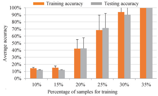 In addition, the classification performance of the proposed IRT–CNN method is also examined by using various percentages of training samples. To reduce the effect of randomness, 20 trails are conducted for each experiment. The average training and testing accuracies are calculated, and their corresponding standard deviations are represented using the positive error bars, as shown in Figure 9. It can be observed that the testing accuracy increased, and its standard deviation decreased as more training samples are used. In addition, the average of classification accuracies of the proposed method is 100% with no standard deviation using 35% of samples for training, showing that 35% training, in particular, using 35 training images, will be sufficient to train the CNN for achieving a highly satisfactory accuracy rate.