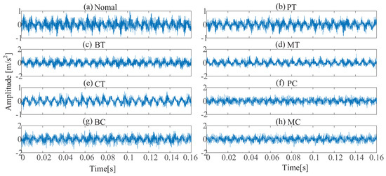 The vibration signals for eight gear-health conditions: (a) healthy condition (b) pitting in the driving tooth (c) a broken tooth in the driving gear (d) a missing tooth in the driving gear (e) crack in the follower tooth (f) pitting in the driving gear with crack in the follower tooth (g) broken tooth in the driving gear with crack in the follower tooth (h) missing tooth in the driving tooth with crack in the follower tooth.
