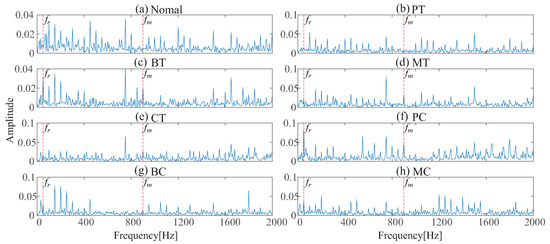 Envelope spectra for eight gear-health conditions: (a) healthy condition (b) pitting in the driving tooth (c) a broken tooth in the driving gear (d) a missing tooth in the driving gear (e) crack in the follower tooth (f) pitting in the driving gear with crack in the follower tooth (g) broken tooth in the driving gear with crack in the follower tooth (h) missing tooth in the driving tooth with crack in the follower tooth.
