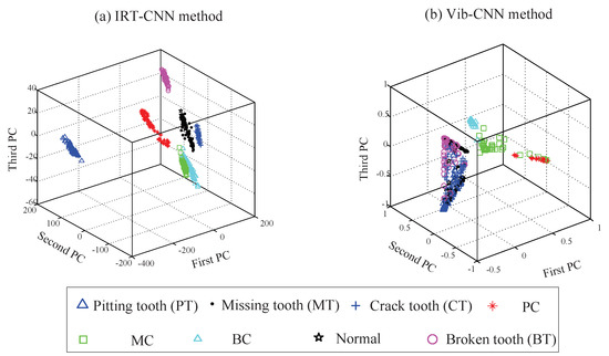 Furthermore, to show the features extracted from IRT images and vibrations, three-dimensional projections are used for visualizing using PCA, as shown in Figure 13. It can be observed that the samples are all distributed around the class center and the samples are discriminated clearly using proposed IRT–CNN method, as shown in Figure 13a. This means that the extracted features from IRT–CNN has the distinguishable and robust information. However, as shown as shown in Figure 13b. The vibration features extracted by CNN are less clustered along with a much wider spread, showing that it is hard to achieve satisfactory result classification. This further demonstrates the IRT images provide wealthy and consistent information regarding the gear’s health conditions.